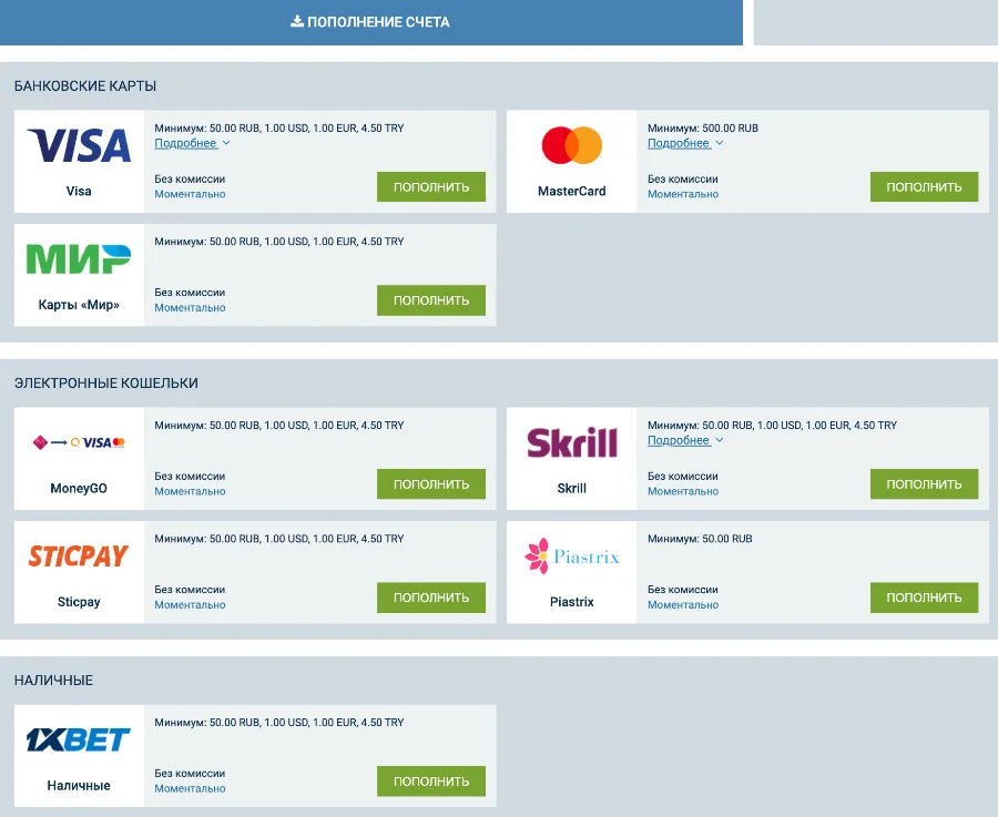 Площадка 1xbet предлагает выгодные условия для пополнения счета. Пополнять депозиты можно на сумму от 1-1,5 евро. Столь минимальные суммы, на которые можно пополнить счет, делают букмекерскую контору доступной даже для пользователей с минимальным банкроллом. Для пополнения баланса необходимо пройти авторизацию (или создать аккаунт), перейти в раздел «Касса», ввести сумму и вписать реквизиты.
